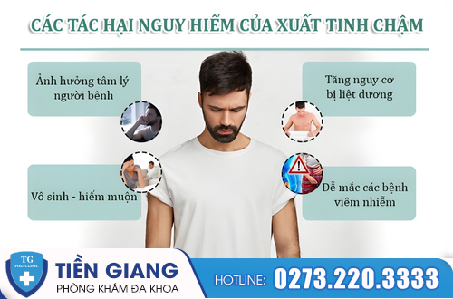 Bệnh xuất tinh chậm nếu để lâu sẽ càng chuyển biến nặng và ảnh hưởng trực tiếp đến với tinh thần nam giới, sức khỏe dương vật, suy giảm ham muốn và e ngại trong chuyện quan hệ, thậm chí cánh mày râu có khả năng mất đi khả năng sinh sản về sau.